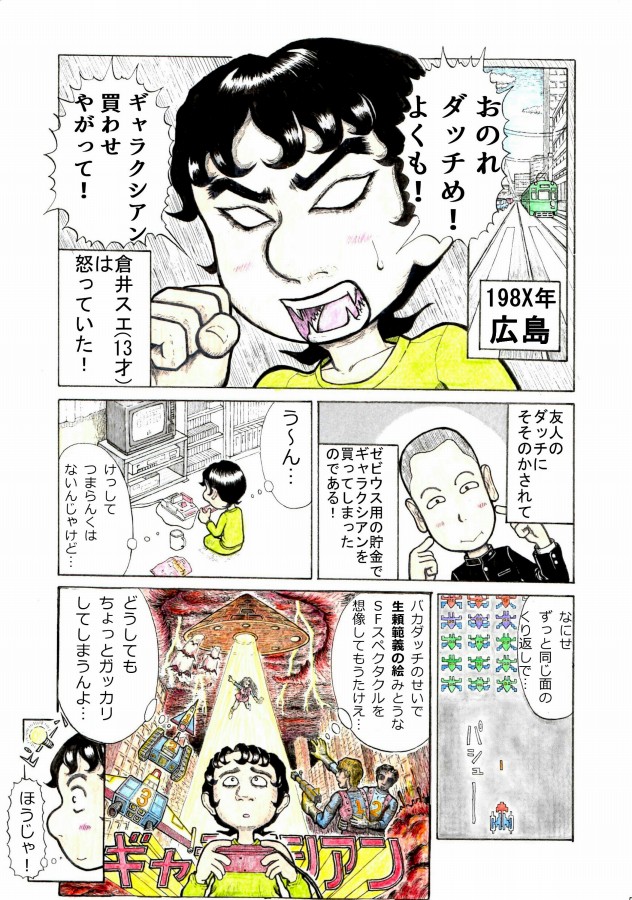 ファミぼうず 第1話「スエ ゼビウスを欲しがる」 ギャグマンガ 2014.11.122019.01.05 ファミコン、マイコン、レトロゲーム…80年代サブカルのマンガです。 思い出のカルチャーをオモチャーと言う! 第2話はこちら↓ ファミぼうず 第2話「スエ ギャラクシアンを くふうして あそぶ」時は80年代。レトロゲームのマンガです。自宅で遊べるナムコット…が遊べない!だってない!お店に!ゼビウスが!(第1話はこちら)第3話はこちら↓■今回のお話の関連商品